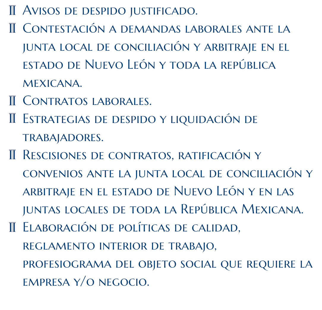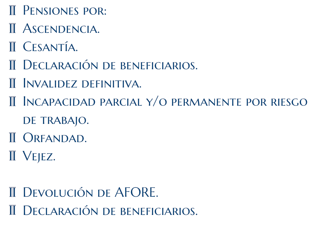 Nos dedicamos a brindarles servicios legales dirigidos a los trabajadores que disfrutan de la rama de la seguridad social en su calidad de asegurados, esto en lo que respecta a la acreditación de los derechos generados en el trascurso de su vida laboral, realizando la obtención eficaz de una pensión, devolución de cuentas de afore, fondos de ahorro de descuentos para obtención de una vivienda, esto ante dependencias gubernamentales, es decir el Instituto Mexicano del Seguro Social, AFORES, Instituto del Fondo Nacional de la Vivienda para los Trabajadores, por lo que les ofrecemos la acreditación de hacer efectivos los derechos que estipula la Ley del Seguro Social, ya sea de manera administrativa o judicial para hacer satisfactorios los derechos sociales ya generados.